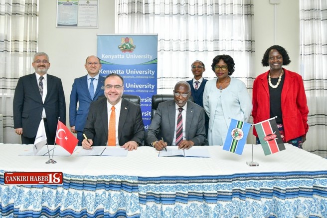 Çankırı Karatekin Üniversitesi ile Kenya’nın en büyük üniversitesi olan Kenyatta Üniversitesi arasında akademik iş birliğini güçlendirmeye yönelik protokol, Rektörümüz Prof. Dr. Mevlüt Karataş ve Kenyatta Üniversitesi Rektörü Prof. Paul Wainaina tarafından imzalandı.