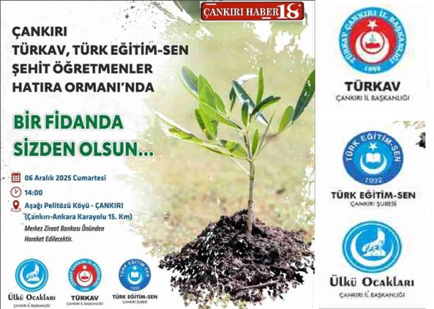 Çankırı-Ankara karayolu 15.Kilometresinde Aşağı Pelitözü köyü sınırları içinde bulunan Çankırı; TÜRKAV, Türk Eğitim-Sen Şehit Öğretmenler Hatıra Ormanına 06.12.2025 Tarihinde Cumartesi günü saat 14.00 de Fidan dikimi yapılacaktır.