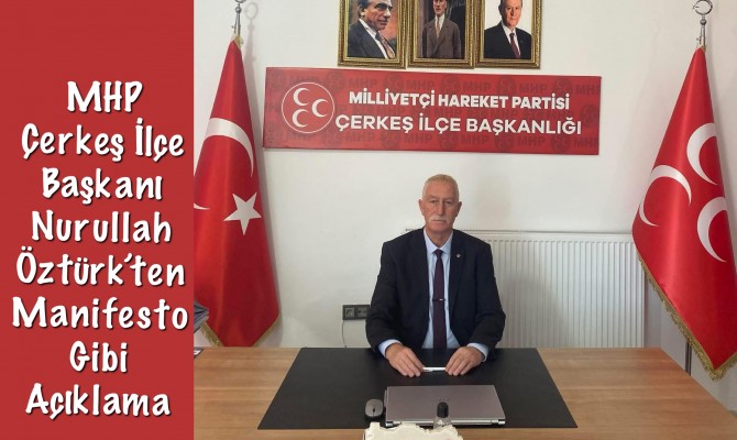 MHP Çankırı Çerkeş İlçe Başkanı Nurullah Öztürk sosyal medya hesabından manifesto gibi açıklama yaparak şunları ifade etti. “Türk milliyetçiliği, yalnızca bir düşünce sistemi değil; aynı zamanda bir duruş, bir ahlak ve bir yaşam biçimidir. Bu kutlu davanın siyasi temsilcisi olan Milliyetçi Hareket Partisi (MHP) kuruluşundan bugüne “Lider, Teşkilat, Doktrin” anlayışıyla yol almış; bu üç temel sütun üzerine inşa edilen sağlam yapısıyla Türk milletinin hizmetinde olmuştur.